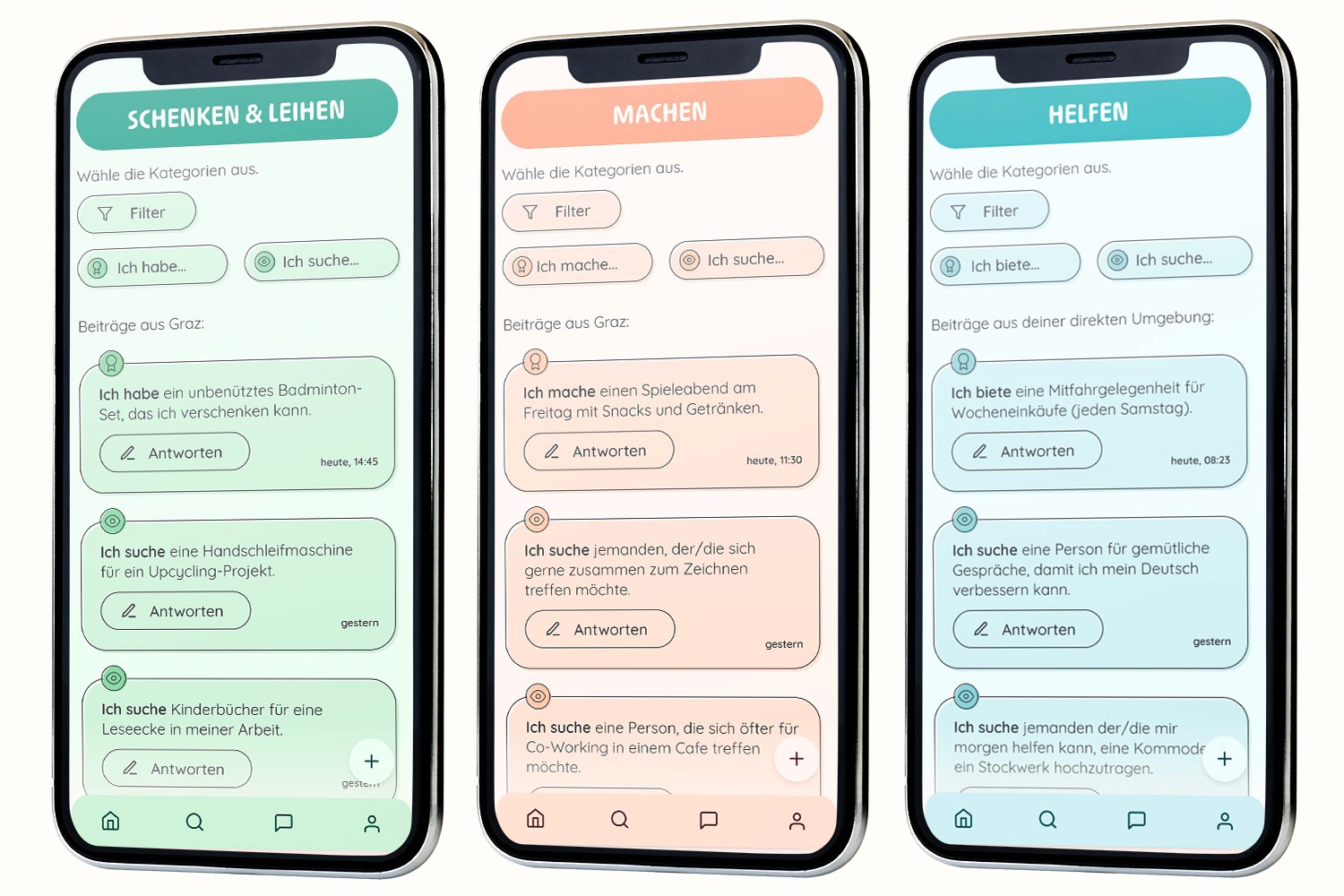 Die App ist genauso vielfältig wie der Mensch selbst: Mit verschiedenen Optionen, werden die unterschiedlichsten Bedürfnisse und Anliegen innerhalb einer Nachbarschaft gedeckt, die über das einfache Kontakteknüpfen hinausgehen. Nachbar:innen können sich zum Skillsharing treffen, unbenutzte Möbelstücke können einfach verschenkt werden, Reparaturprofis können gefunden werden.